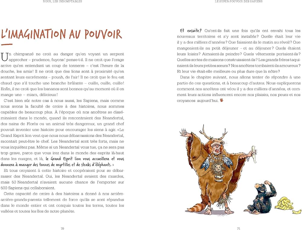 Ici, l'idée d'un darwinisme social sans fard est vendue aux jeunes comme historique : le plus fort peut s'imposer. Harari sait raconter : les grands animaux et d'autres espèces humaines ont été exterminés sans ménagement par Homo Sapiens.